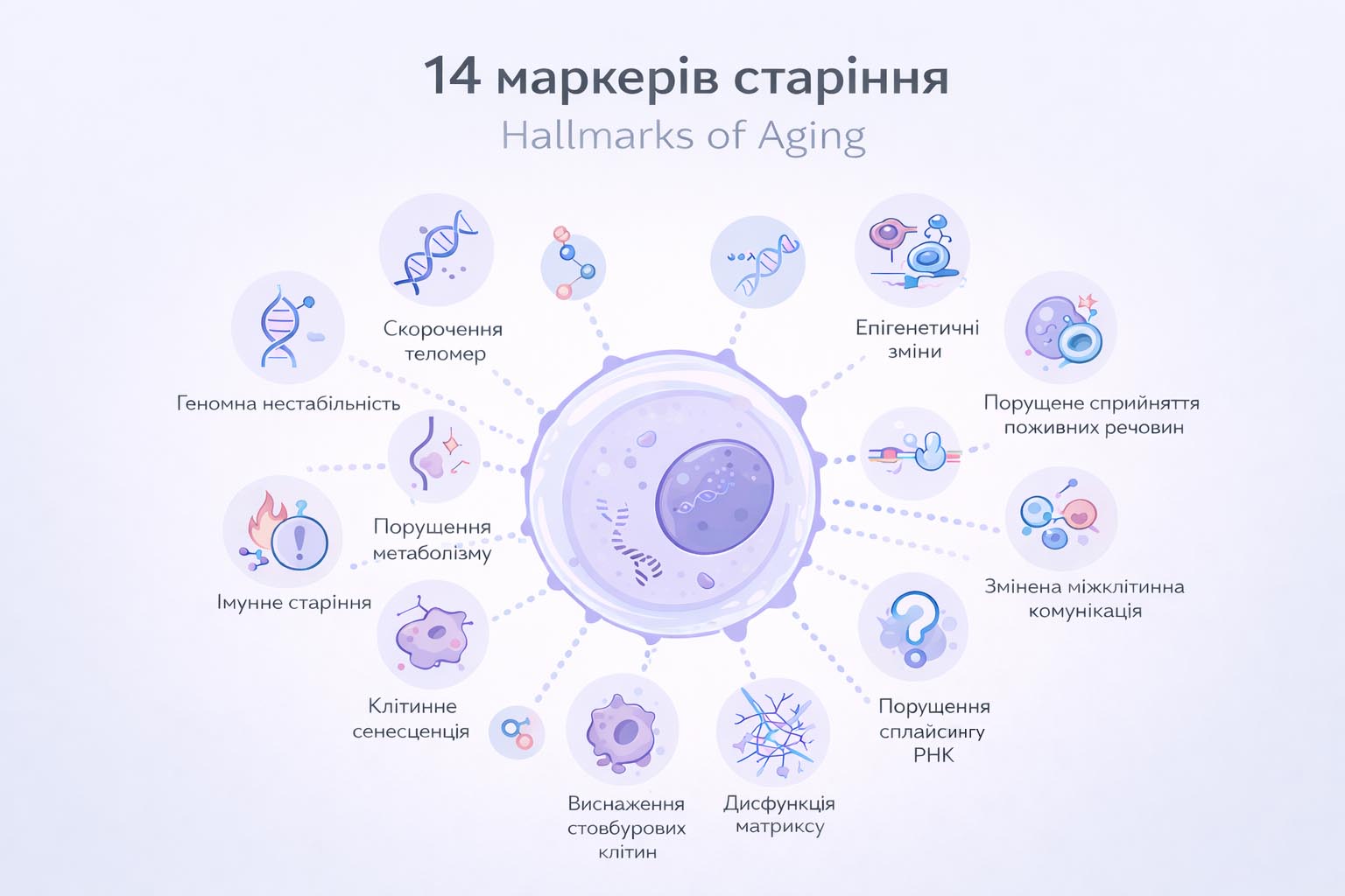 Старіння — це не один процес і не сума «накопичених років». Сучасна біологія розглядає його як системне порушення підтримки клітинної та тканинної гомеостази, яке виникає внаслідок збою низки фундаментальних механізмів. У 2013 році була запропонована концепція 9 маркерів старіння, яка згодом стала базовою для геронтології. З розвитком молекулярної біології, імунології та системної медицини ця модель була розширена до 14 маркерів, щоб охопити запалення, імунне старіння, порушення тканинної регенерації та нові рівні біологічної складності.