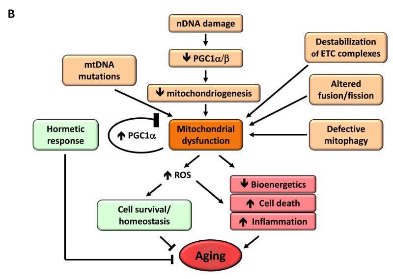Рисунок 3. Метаболічні зміни. Мітохондріальна дисфункція. Функція мітохондрій порушується через мутації мтДНК, пов’язані зі старінням, зниження мітохондріогенезу, дестабілізацію комплексів ланцюга транспорту електронів (ЕТК), змінену динаміку мітохондрій або порушення контролю якості мітофагією. Сигнали стресу та порушення функції мітохондрій генерують активні форми кисню (ROS), які нижче певного порогу індукують сигнали виживання для відновлення клітинного гомеостазу, але на вищих або тривалих рівнях можуть сприяти старінню. Аналогічно, легке пошкодження мітохондрій може викликати гормональну реакцію (мітогормезис), яка запускає адаптивні компенсаторні процеси.