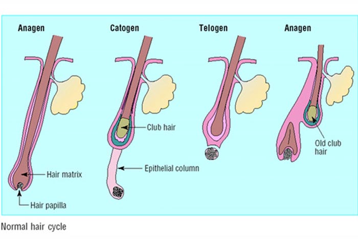 Нормальний цикл росту волосся – кожна волосина телогенової фази замінюється новою волосиною анагенової фази.