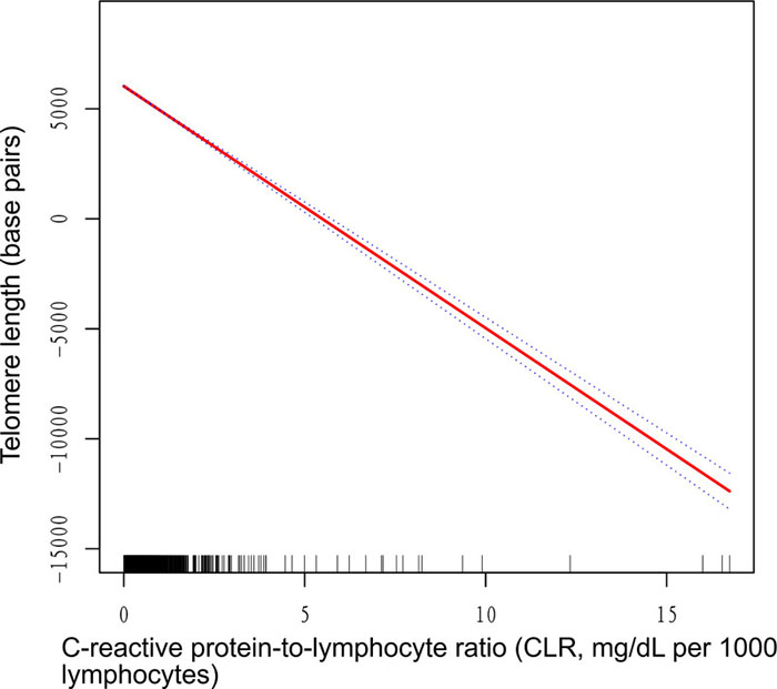 Цей графік показує, що зі зростанням рівня хронічного запалення в організмі (CLR) довжина теломер зменшується. Іншими словами, чим більше запалення — тим швидше клітини біологічно старіють. Зв’язок є лінійним і статистично достовірним, навіть у загальній популяції.