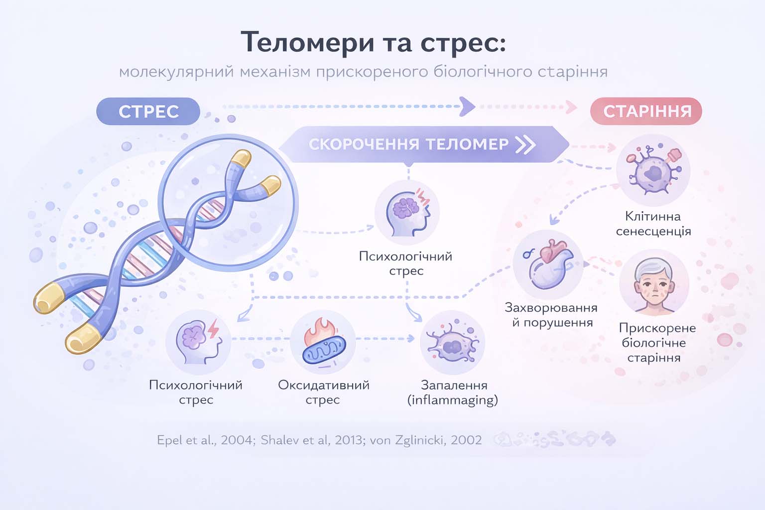За останні 20 років теломери стали одним із найбільш досліджених маркерів біологічного старіння, а зв’язок між психологічним, фізіологічним та оксидативним стресом і прискореним скороченням теломер має потужну експериментальну та клінічну доказову базу.