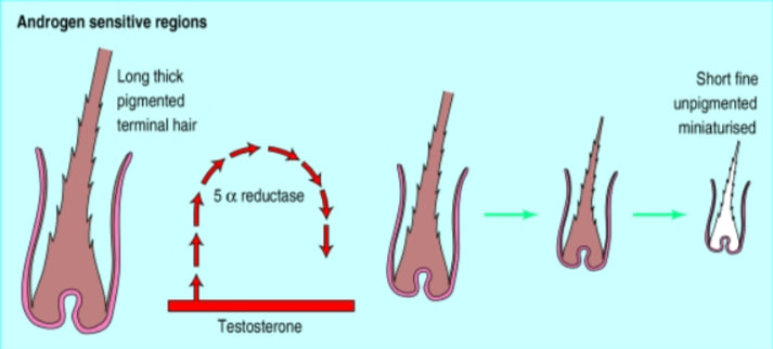 Також підвищується чутливість фолікулів до дигідротестостерону (DHT), що спричиняє мініатюризацію волосся.
