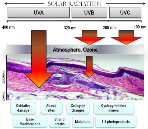 На рисунку показаний вплив ультрафіолетового випромінювання (UVA, UVB) на шкіру: глибина проникнення та типи пошкоджень, включаючи оксидативний стрес і ушкодження ДНК.