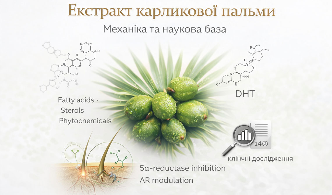 Інтерес до екстракту карликової пальми зумовлений його біологічно активними ліпідно-стерольними сполуками, які можуть впливати на ключові механізми, пов’язані з андроген-залежним випадінням волосся.