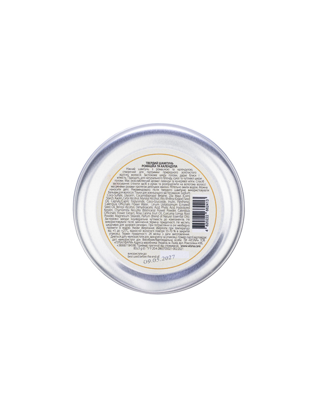 Твердий шампунь Ромашка та Календула — ніжне очищення і догляд для натурального блонду та чутливої шкіри голови. Ромашка м’яко підкреслює золотистий відтінок, а календула заспокоює подразнення. Ефірна композиція лаванди та м’яти створює атмосферу релаксу та спокою, перетворюючи миття голови на SPA-ритуал.
