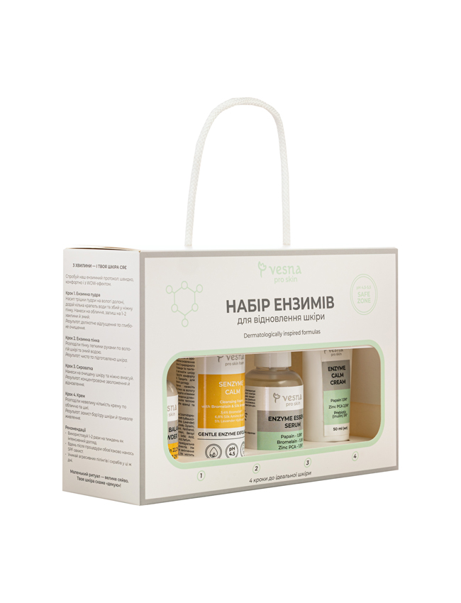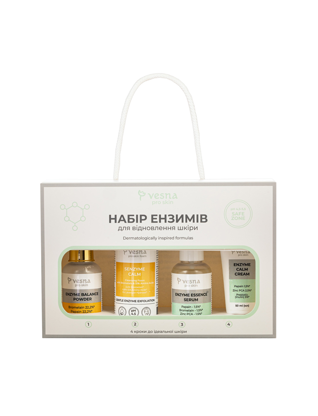 Набір Ензимний створений для комплексного догляду за шкірою з використанням ферментів. Він поєднує в собі делікатне очищення, заспокійливу дію та відновлення природного балансу. Завдяки цьому набір допомагає зменшити подразнення, підтримати мікробіом, вирівняти тон і зробити шкіру гладкою та сяючою.