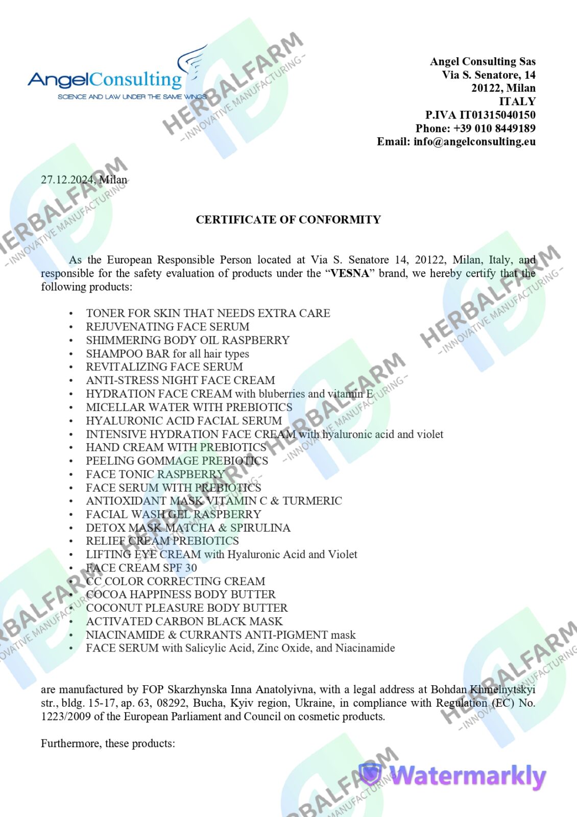 На усю сировину та тару, що використовує VESNA y виробництві косметики виробництво має сертифікати якості та інші документи, що засвідчують безпечність сировини чи тари.